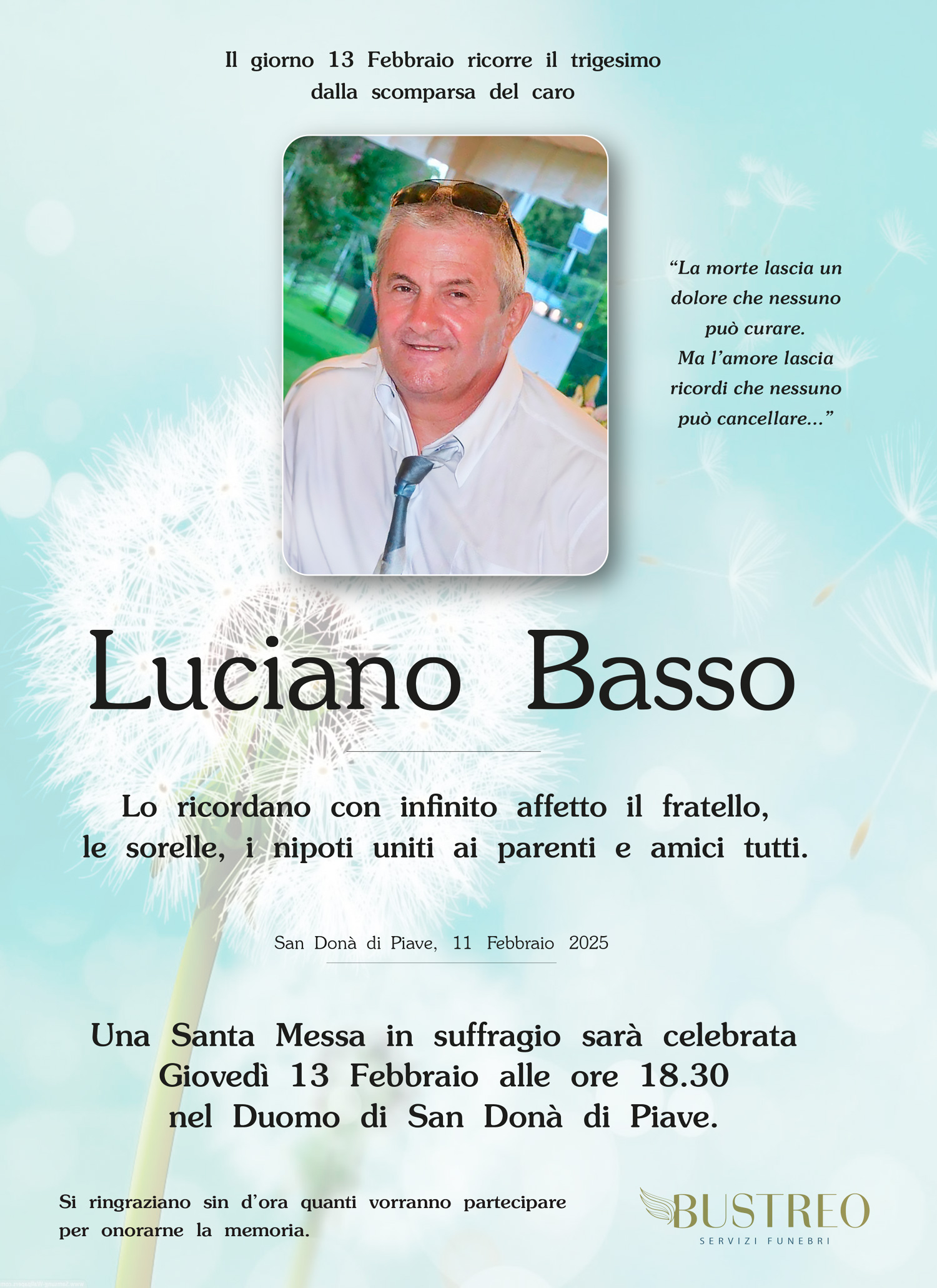 Possa il vostro dolore trovare conforto nel sostegno del Signore e nella certezza che vostro padre è sempre vicino a voi. Il calore della nostra amicizia riscaldi i vostri cuori.