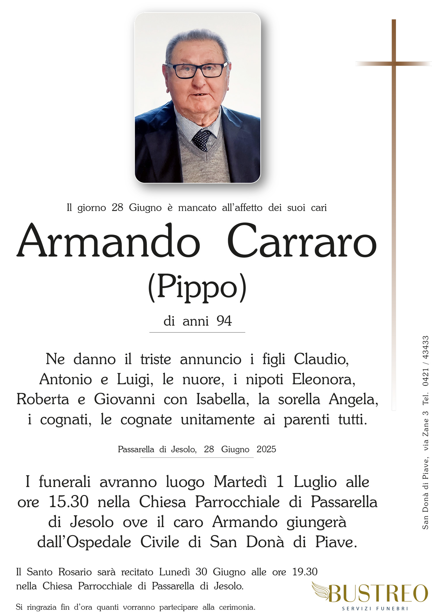 Possa il vostro dolore trovare conforto nel sostegno del Signore e nella certezza che vostro padre è sempre vicino a voi. Il calore della nostra amicizia riscaldi i vostri cuori.