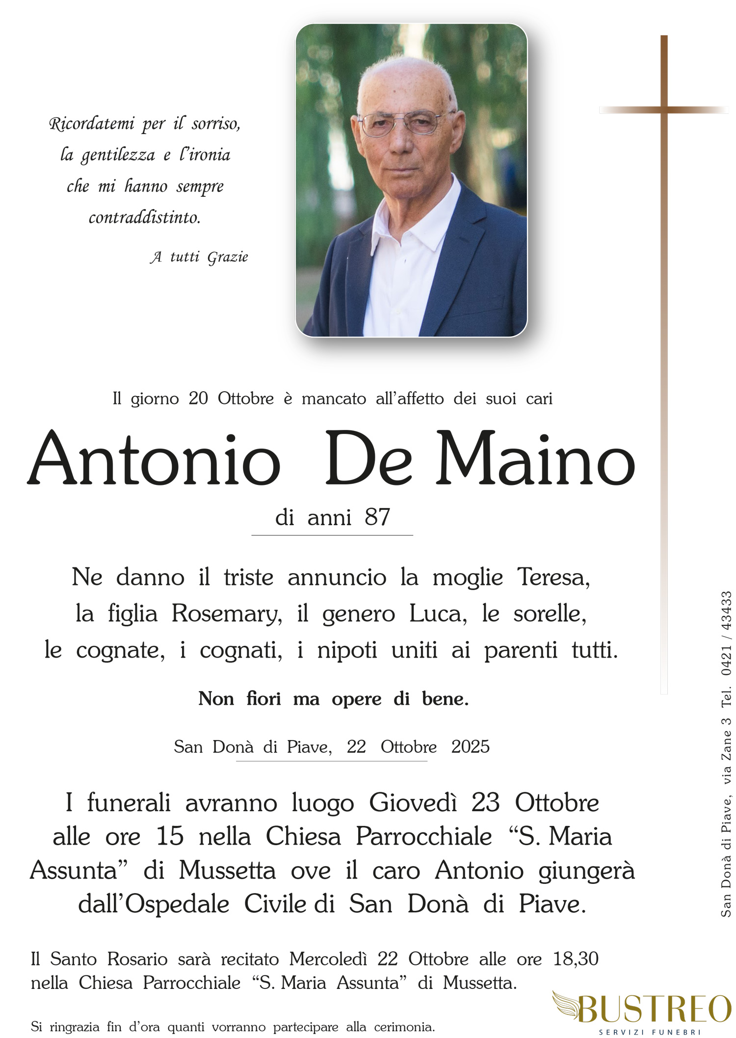 Possa il vostro dolore trovare conforto nel sostegno del Signore e nella certezza che vostro padre è sempre vicino a voi. Il calore della nostra amicizia riscaldi i vostri cuori.